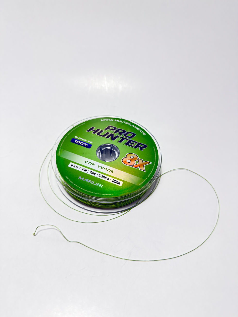 A Linha Multifilamento Pro Hunter 8x Maruri possui 100 metros de comprimento e é construída com fibras trançadas 100% PE 8X, proporcionando maior resistência, durabilidade e sensibilidade durante a pesca.